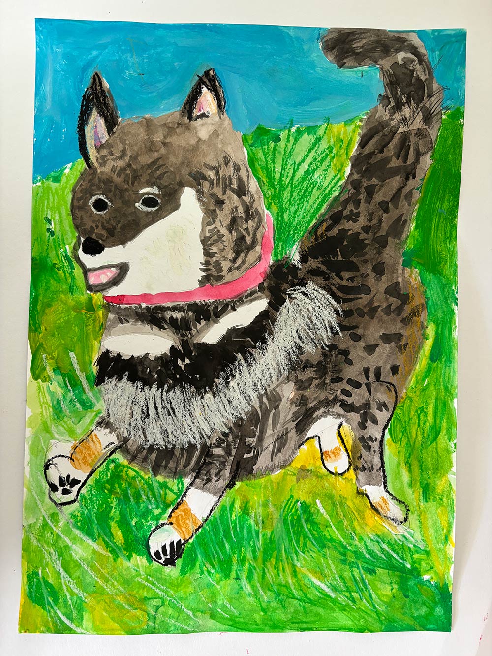 いえでわたしがかっている犬のぎんとこうえんではしっているところをかきました。