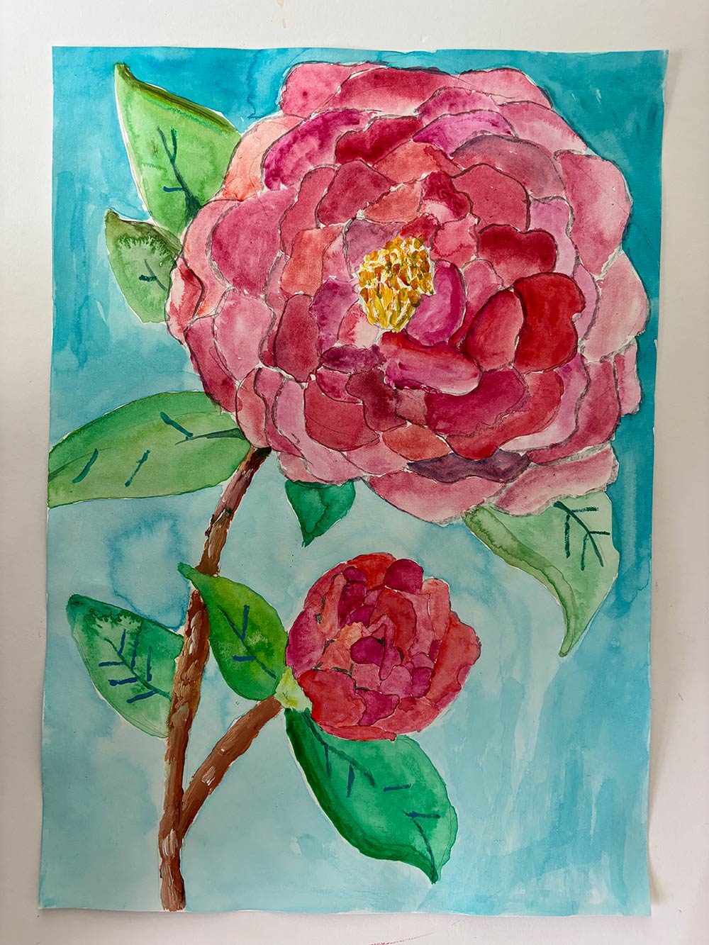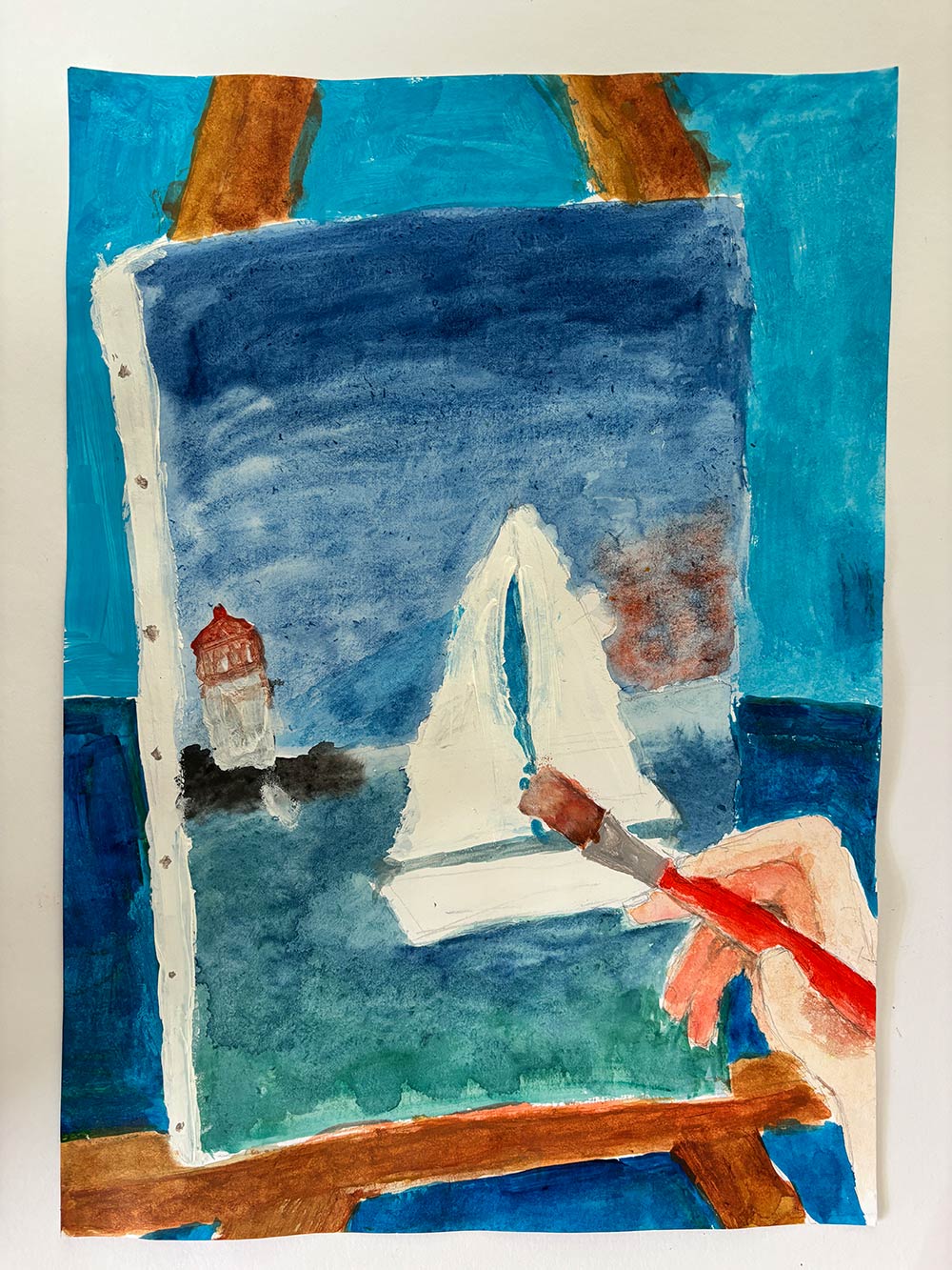自分は絵が好きなので、絵をかいている絵をかきました。うしろのはいけいは海です。