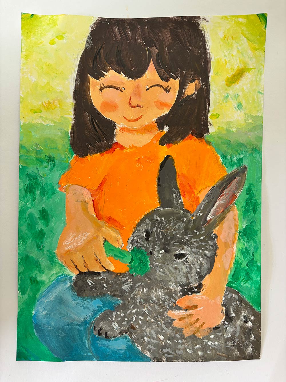 私が書いたのは友達のうさぎです。この絵を描いた理由は、このうさぎを見るととても心がいやされるからです。工夫した所はうさぎの毛なみです。またうさぎにえさをあげたいです。
