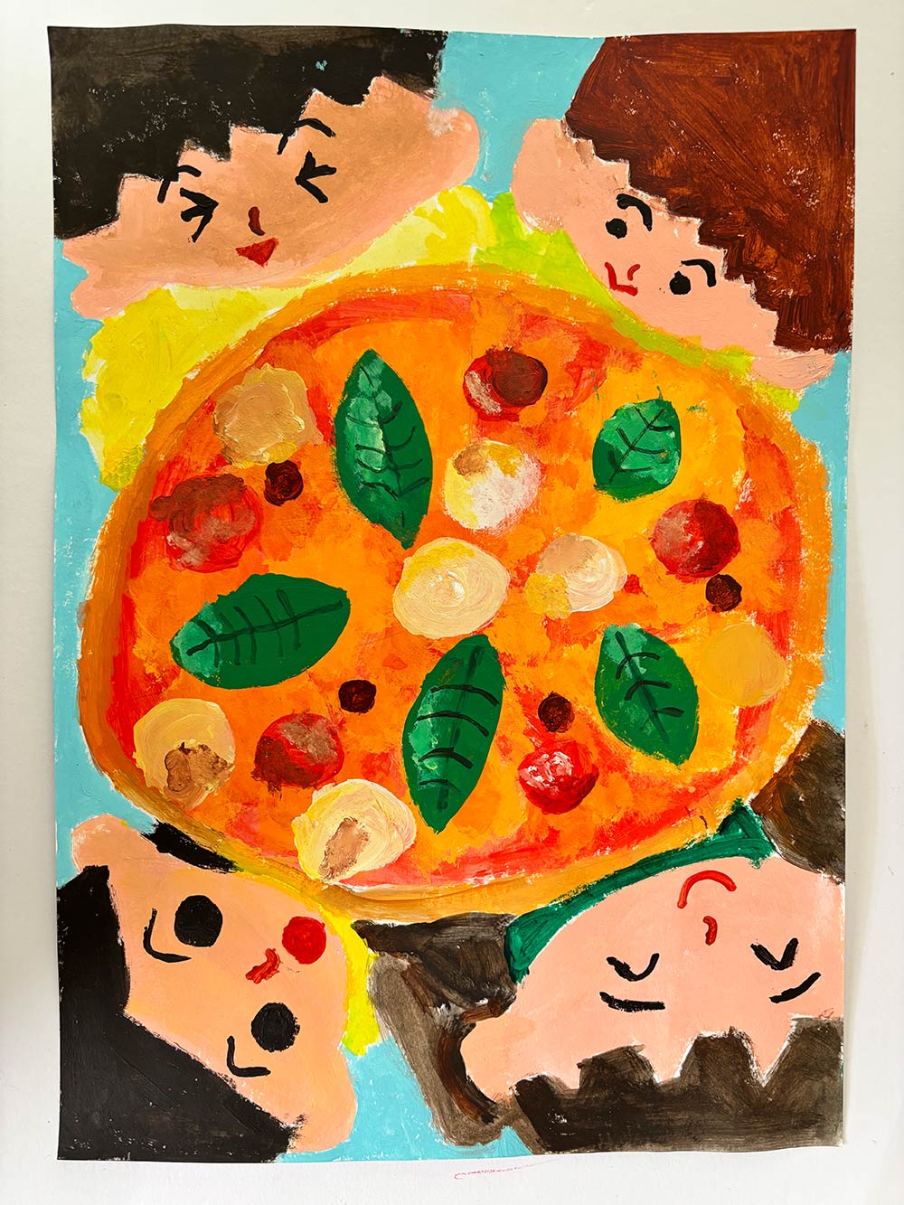 家族で、届いたきょ大ピザを見て、おどろいている様子を描きました。