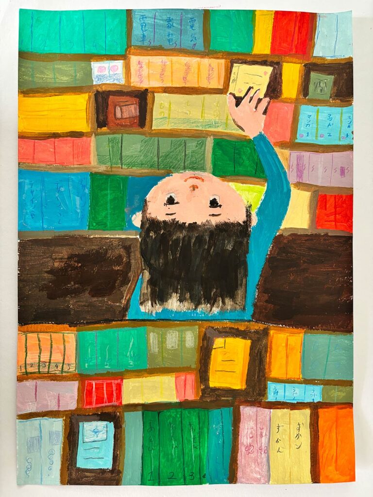 私は本屋で本をえらぶ時間が一番しあわせなのでこの絵をかきました。