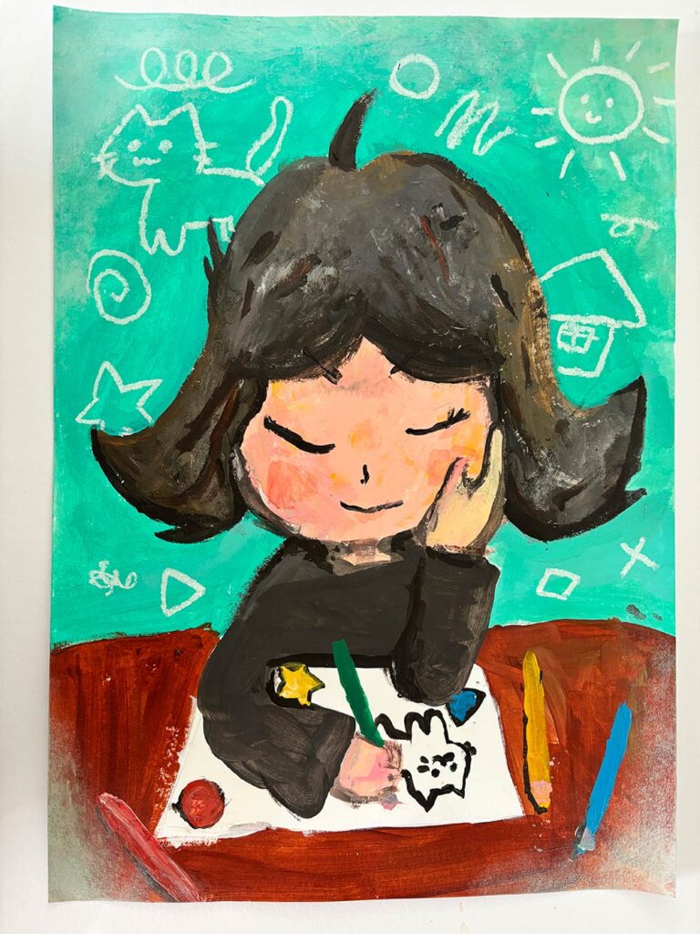 いろんな絵を描いている時が私のしあわせなじかんです。絵をかいているとこころがおちついてしあわせなきもちになるからです。