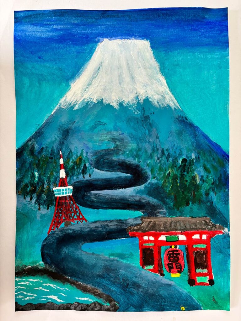 日本の観光地など様々な場所などに行き、未知を知ったり、綺麗な景色を見たりする時間が、自分は幸せに感じるため、雷門、富士山等を描き、以上のことを表しました。
