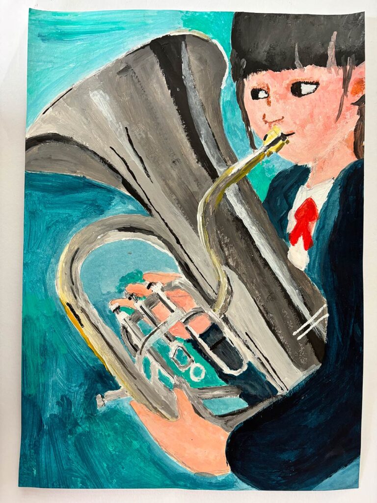 吹奏楽の日常をテーマにして、音楽を奏でている時間が私にとって一番幸せな時ということをイメージして、人の表情を笑っている様子をえがきました。