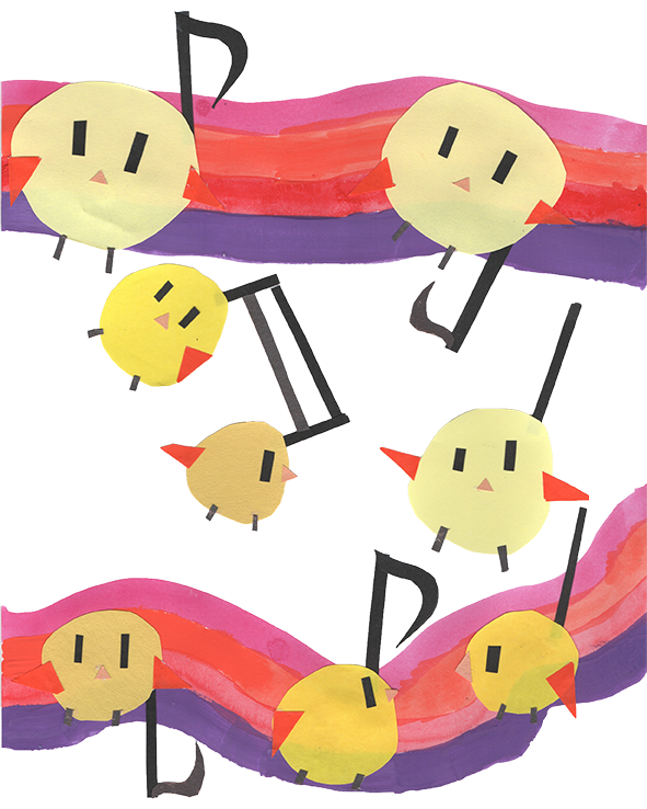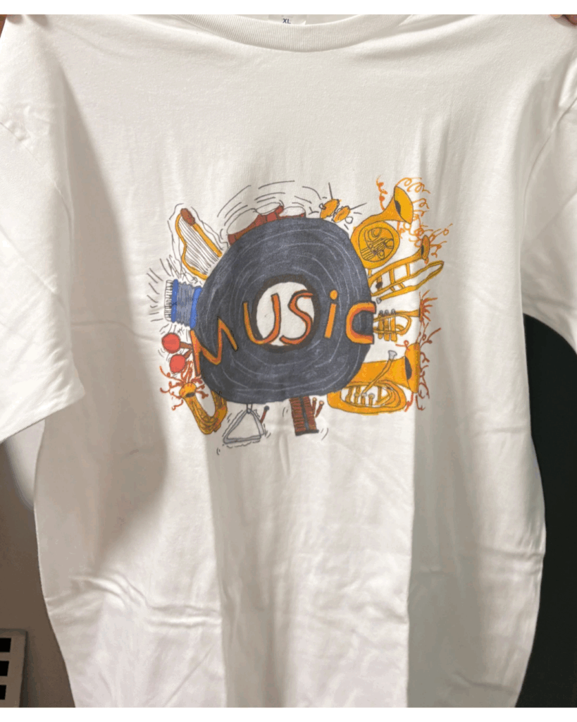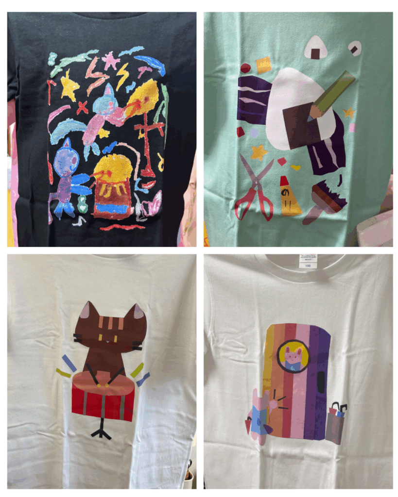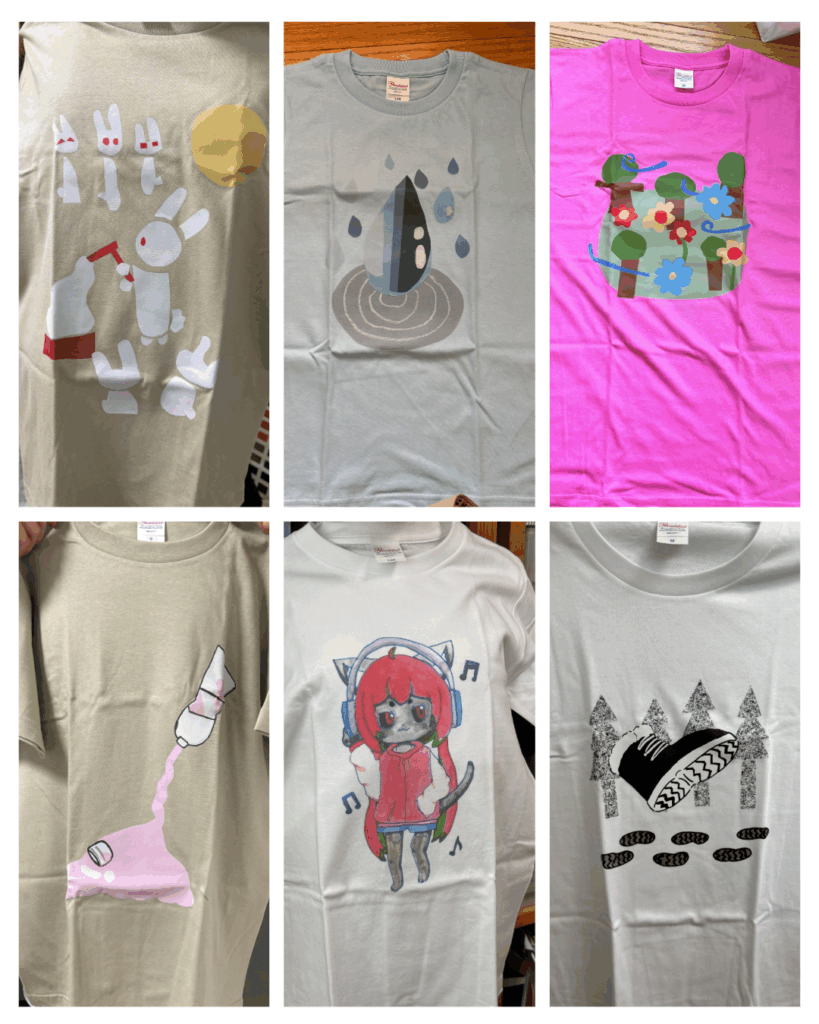 Tシャツデザイン(音) デザイン 2025.09.08 ねこちゃんがよるのえんそうおしているところおかきました ねこのくびについているすずのおと。 フランスパンのけんばんハーモニカにしました!!まわりに音ぷやフランスパンをかきました。たべることがすきなのでこれにしました! この絵は、おにぎりの絵をつくるためにカサカサ、ザザクザクなどの音で、音楽界をひらいているようすを書きました。 すいてきの落ちる音をかきました。 うさぎがにんじんを食べている音を作りました。 ナシちゃんがカラフルなおんぷにのっているところをかきました。 音ぷの丸いところをひよこに見たてました。 ねこがたいこをたたいている絵です。 カニのはさみ部分の「チョッキ」「シャッキン!」みたいな音を意しきしたり、他にも水たまりを使って「ピシャ」「ピチャン、パチャン」みたいな音をいれてカニたちが楽しくはねているいんしょうにしました。 雨の音が好きだからかいた 私は絵の具のブシュとした音を書きました。工夫したとこはブシュとした音を表現するためにフタがふきとんだようにかいたところです。 おもちのもちもち感の音がいいなと思ったのと、おもちといえば月、月といったらうさぎとれんそうしてつくりました。 うさぎがドアをたたいている音を作りました。 自分が「音楽といったら」と思いついた物を描きました。自分はすいそう楽ぶに入っているので、ふく楽器を多く描いています。 私が考えたネコミミの女の子が音楽を聴いている所をかきました。立体になるように、かげのつけ方を気をつけました。 3びきのミジンコたちがみんなで話している音です。 自然な音はとても落ち着きます。芝生で横になっているとき、大空をみながら風と木々や花がなかよく歌っているようです。 この絵で表現した音は、ハイキングをしている時の足音です。靴の周りに木をつくることで、森の中ということを表し、足跡で歩いているということが分かるようにしました。 声の音は人によっていろんな形があると思っていて、声をいろんな形で表しました!声は人によって違うのがいいですよね。 カメラは写真をとる時の「パシャ」の音です。人を写すときに笑顔でとれるように犬っぽい感じにしました。