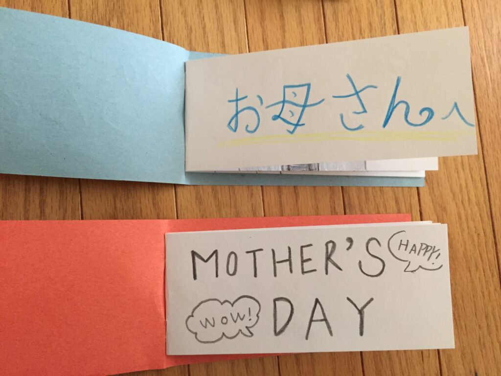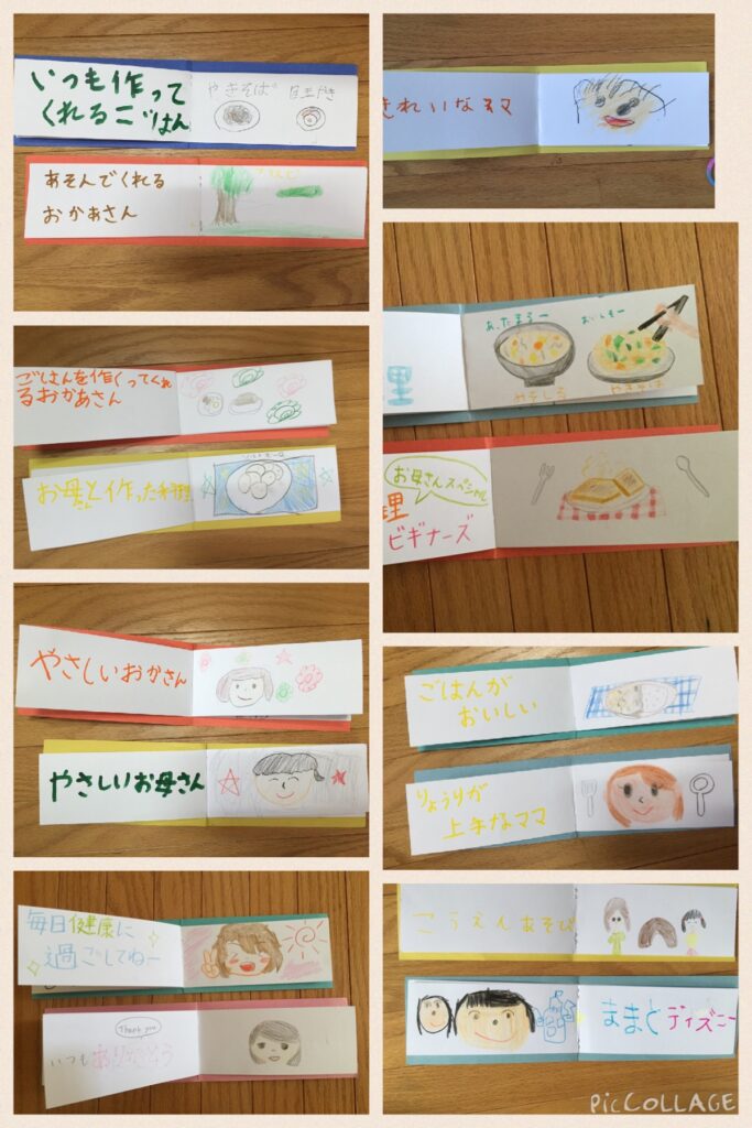 母の日のためのミニブックづくり。お母さんのすきなところをたくさん描きました。